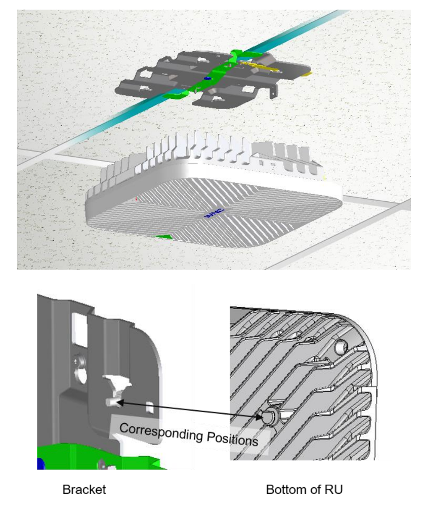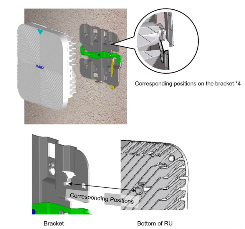 3、在 RU 底部,将四个支脚对准支架上的对应位置,向下压并滑入支架完成固定。